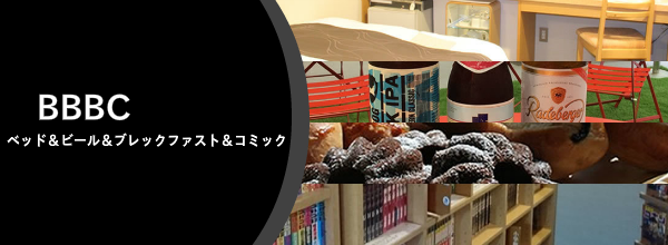 ベッド・アンド・ブレックファスト(Bed and Breakfast)とは、イギリスや北米、アイルランド、ニュージーランド、オーストラリアなど、主に英語圏各国における(多くの場合小規模な)宿泊施設のことを言います。この言葉に当館の特色であるビールとコミックを付けました。トリプルB&Cです!